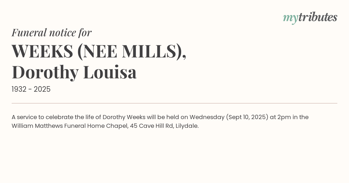 17°CA service to celebrate the life of Dorothy Weeks will be held on Wednesday (Sept 10, 2025) at 2pm in the William Matthews Funeral Home Chapel, 45 Cave Hill Rd, Lilydale.