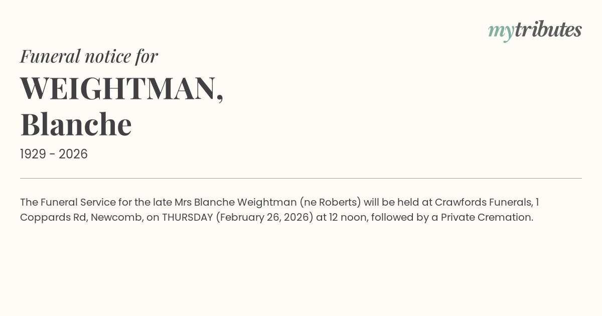 17°CThe Funeral Service for the late Mrs Blanche Weightman (née Roberts) will be held at Crawfords Funerals, 1 Coppards Rd, Newcomb, on THURSDAY (February 26, 2026) at 12 noon, followed by a Private Cremation.