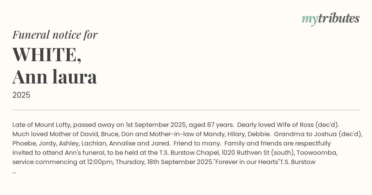 Family and friends are respectfully invited to attend Ann's funeral, to be held at the T.S. Burstow Chapel, 1020 Ruthven St (south), Toowoomba, service commencing at 12:00pm, Thursday, 18th September 2025.