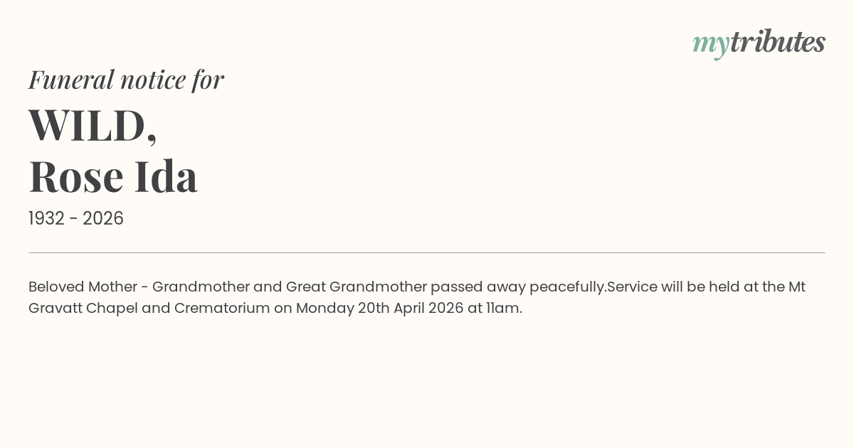 Service will be held at the Mt Gravatt Chapel and Crematorium on Monday 20th April 2026 at 11am.