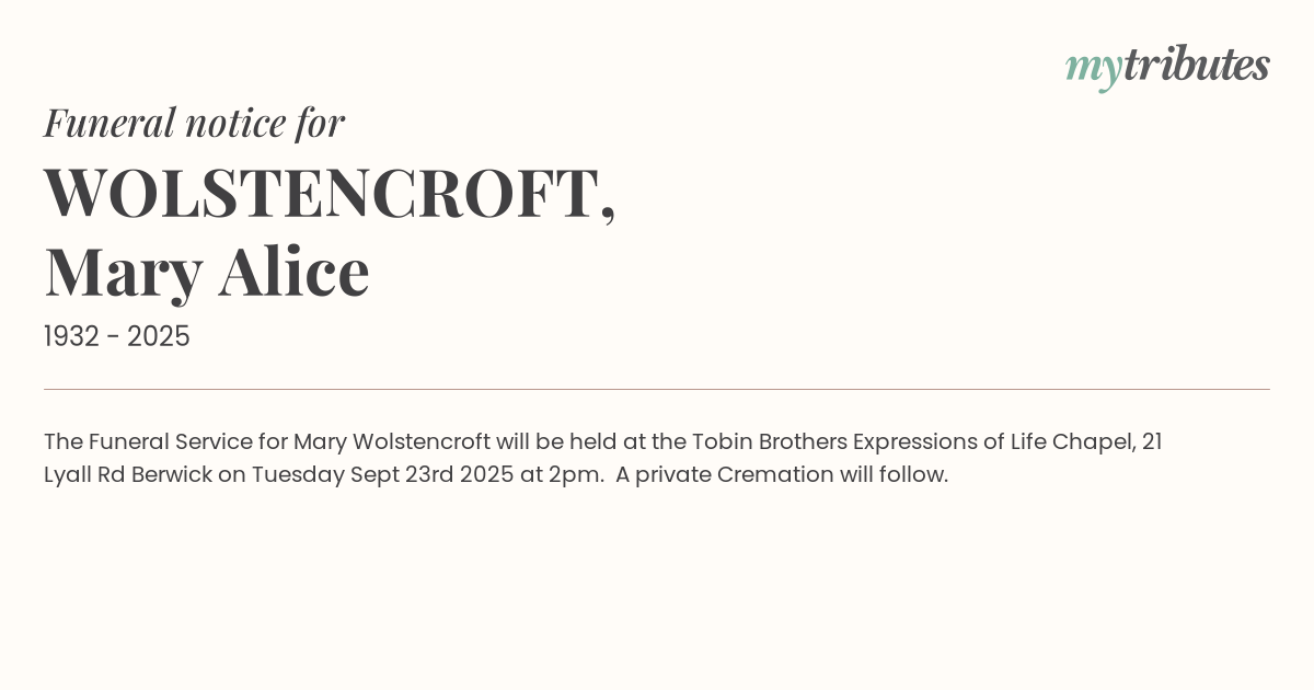 17°CThe Funeral Service for Mary Wolstencroft will be held at the Tobin Brothers Expressions of Life Chapel, 21 Lyall Rd Berwick on Tuesday Sept 23rd 2025 at 2pm. A private Cremation will follow.