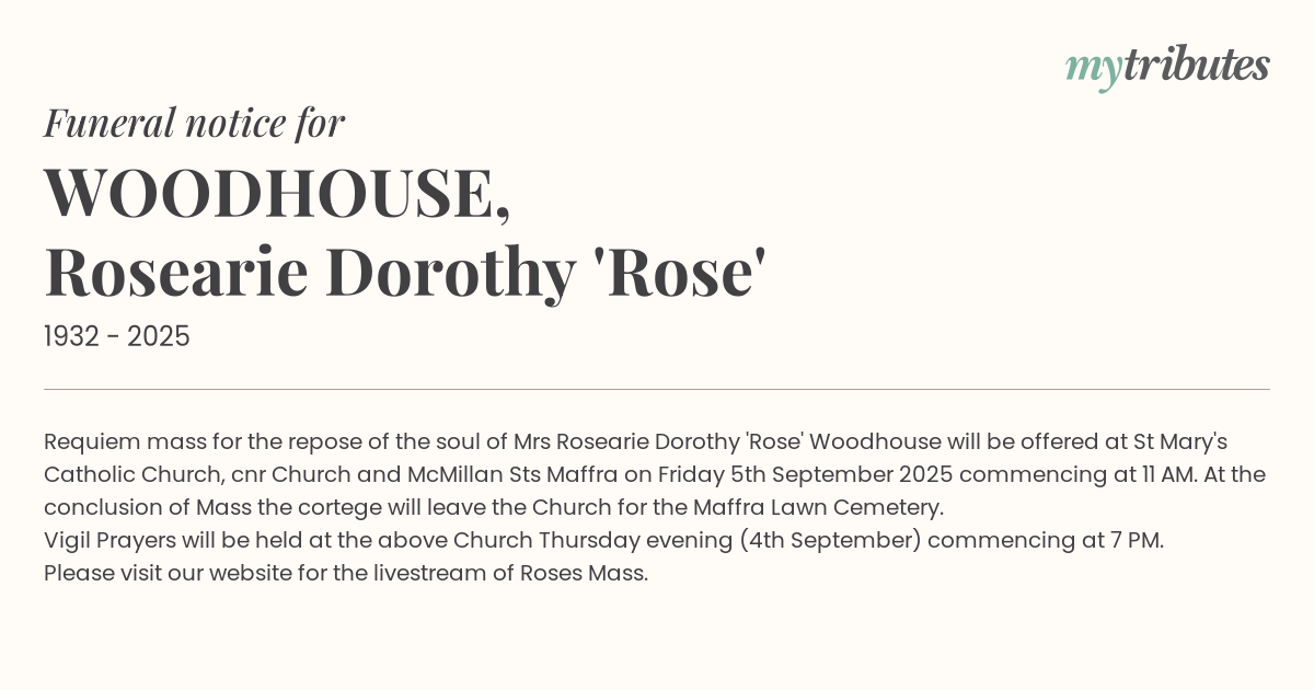 17°CRequiem mass for the repose of the soul of Mrs Rosearie Dorothy 'Rose' Woodhouse will be offered at St Mary's Catholic Church, cnr Church and McMillan Sts Maffra on Friday 5th September 2025 commencing at 11 AM. At the conclusion of Mass the cortege will leave the Church for the Maffra Lawn Cemetery.