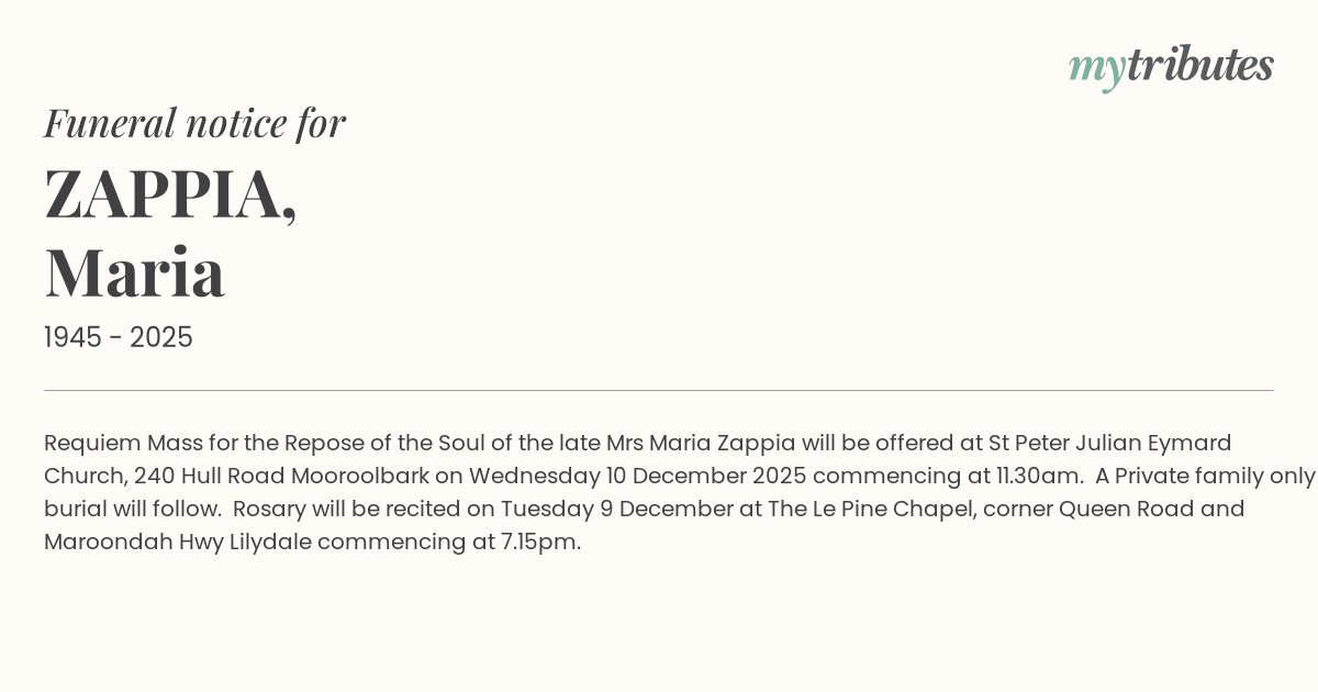 17°CRequiem Mass for the Repose of the Soul of the late Mrs Maria Zappia will be offered at St Peter Julian Eymard Church, 240 Hull Road Mooroolbark on Wednesday 10 December 2025 commencing at 11.30am. A Private family only burial will follow. Rosary will be recited on Tuesday 9 December at The Le Pine Chapel, corner Queen Road and Maroondah Hwy Lilydale commencing at 7.15pm.