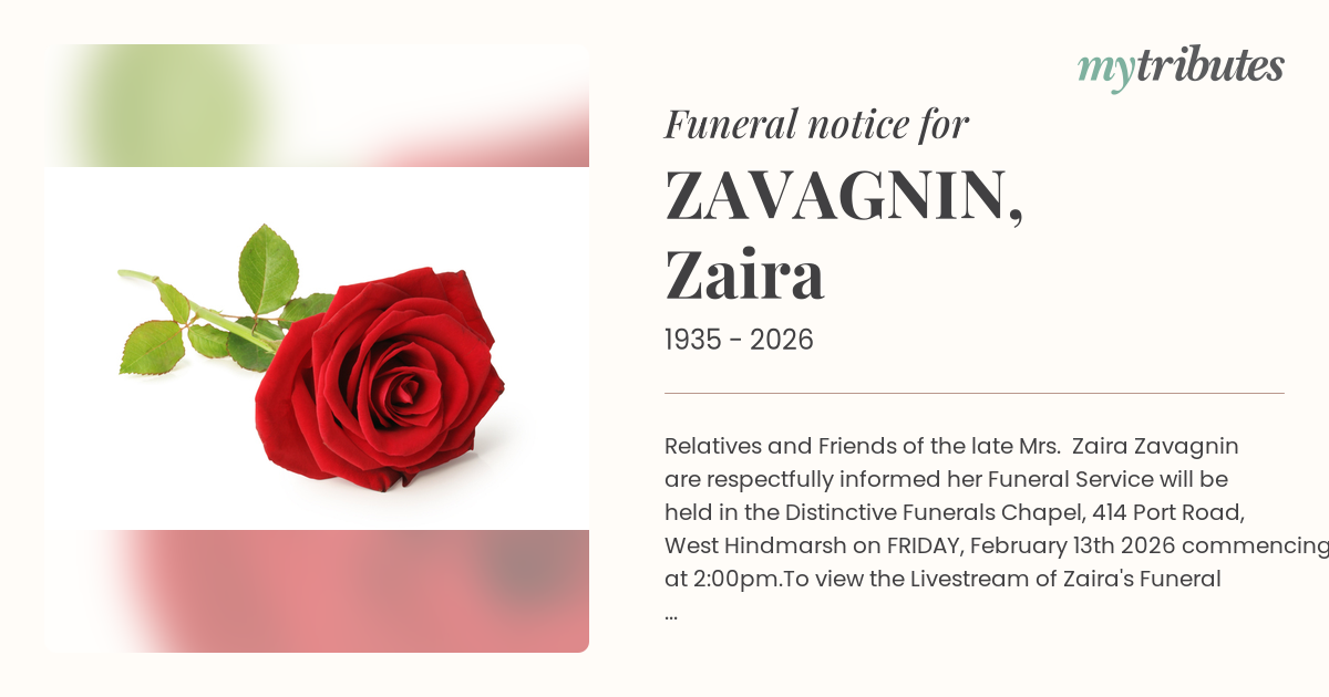 17°CRelatives and Friends of the late Mrs. Zaira Zavagnin are respectfully informed her Funeral Service will be held in the Distinctive Funerals Chapel, 414 Port Road, West Hindmarsh on FRIDAY, February 13th 2026 commencing at 2:00pm.