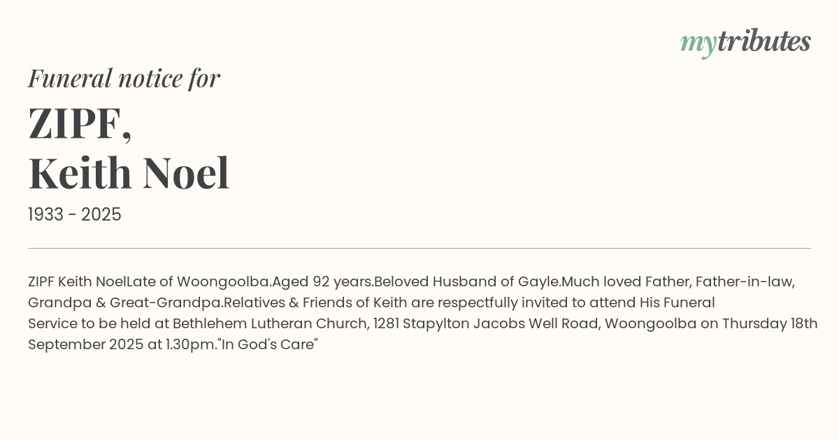 Relatives & Friends of Keith are respectfully invited to attend His Funeral Service to be held at Bethlehem Lutheran Church, 1281 Stapylton Jacobs Well Road, Woongoolba on Thursday 18th September 2025 at 1.30pm.