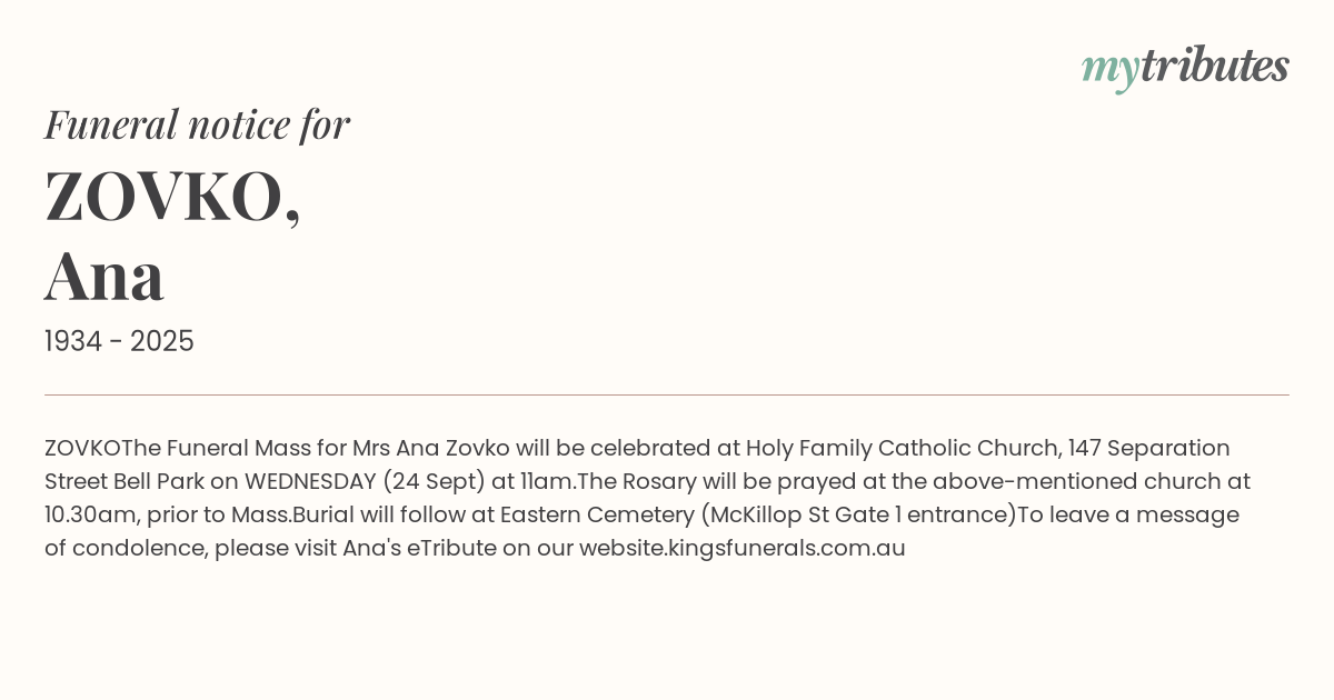 Mrs Ana Zovko will be celebrated at Holy Family Catholic Church, 147 Separation Street Bell Park on WEDNESDAY (24 Sept) at 11am.